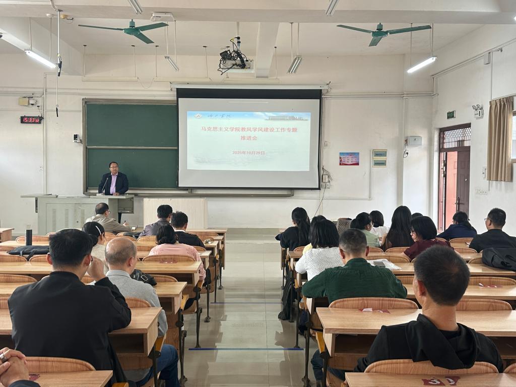 10月29日下午,马克思主义学院于弘毅楼2-401教师召开教风学风建设工作专题推进会,全体教师参会。