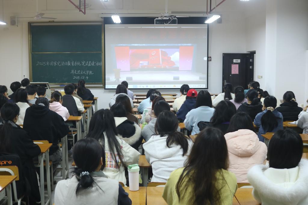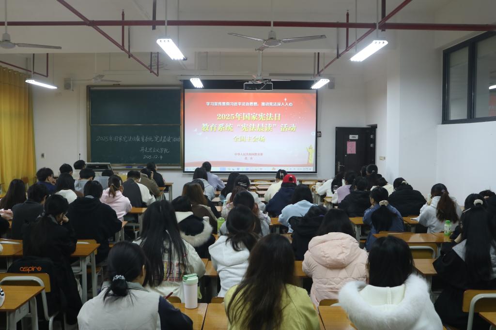 为深入学习宣传宪法,弘扬宪法精神,12月4日,马克思主义学院在致远楼606室组织开展国家宪法日“宪法晨读”主题活动。辅导员银琳杏及思政专业2023级、2024级学生代表现场参加,全院师生以“线上线下”融合形式参与其中,让宪法精神自然融入校园日常学习与生活。